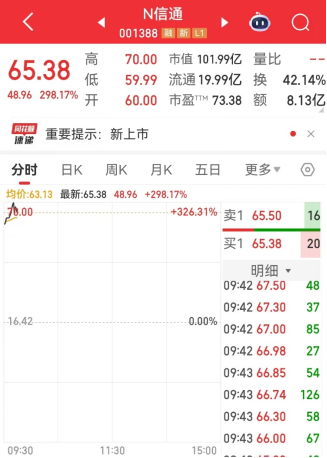 N信通今日上市,开盘价60元,开盘上涨265.41%。公司系一家以电力、通信等特定行业运行维护为核心服务目标的工业物联网智能终端及系统解决方案提供商,公司主营业务旨在通过工业物联网智能终端及系统解决方案解决客户在运行维护环节的综合性智能化运维需求。