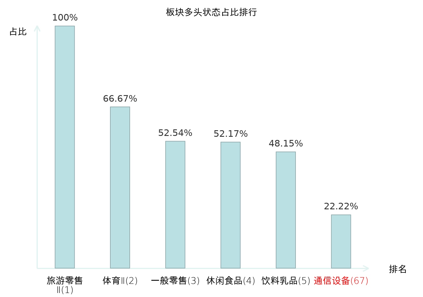 全市场所有行业板块中主力多头状态占比排名中,旅游零售Ⅱ板块位居第一。农业综合Ⅱ板块名次提升最快,较昨日上升109位。