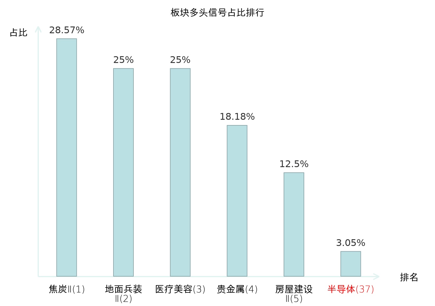 全市场所有行业板块中主力多头信号占比排名中,焦炭Ⅱ板块位居第一。医疗美容板块名次提升最快,较昨日上升124位。