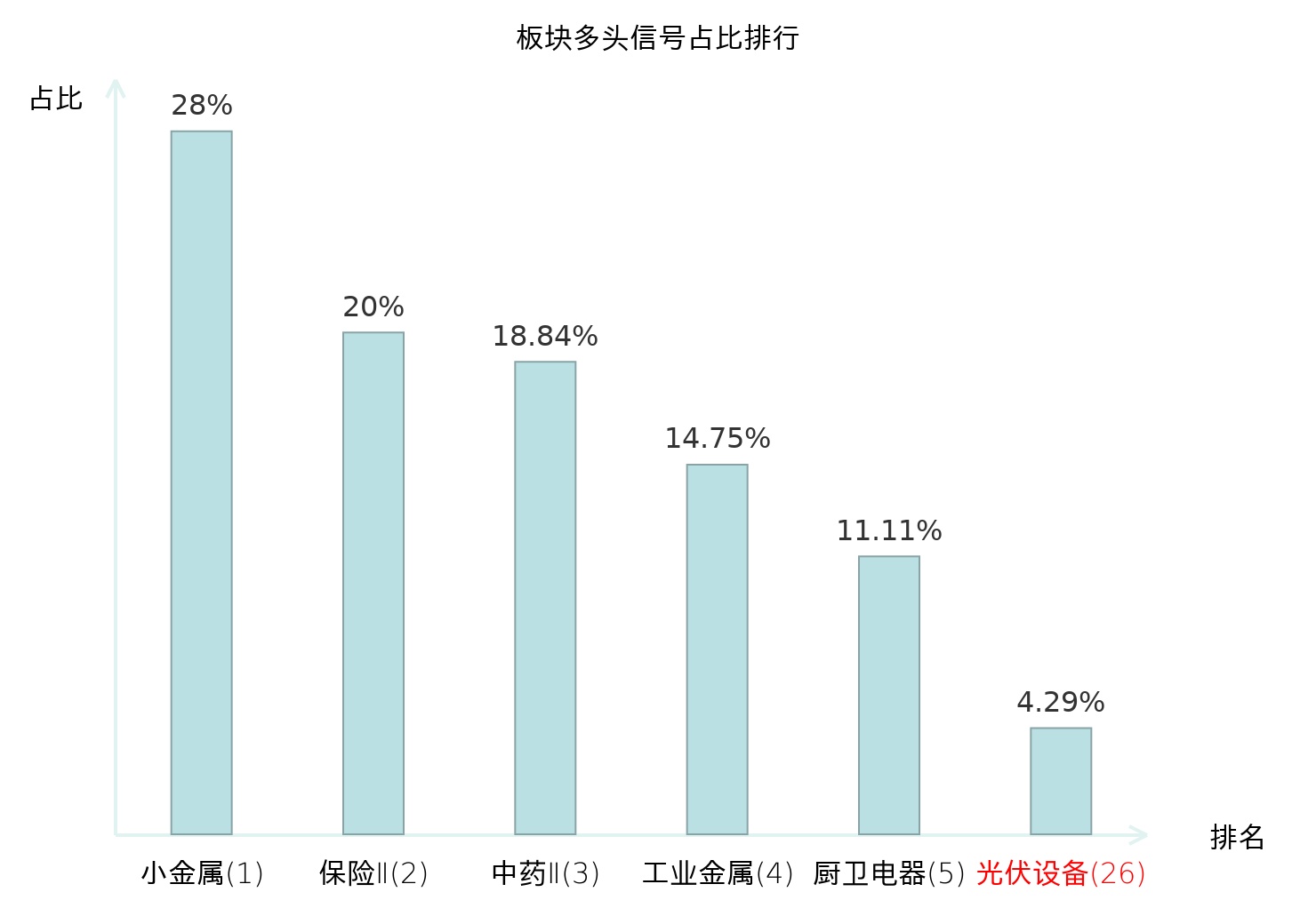 全市场所有行业板块中主力多头信号占比排名中,小金属板块位居第一。保险Ⅱ板块名次提升最快,较昨日上升123位。