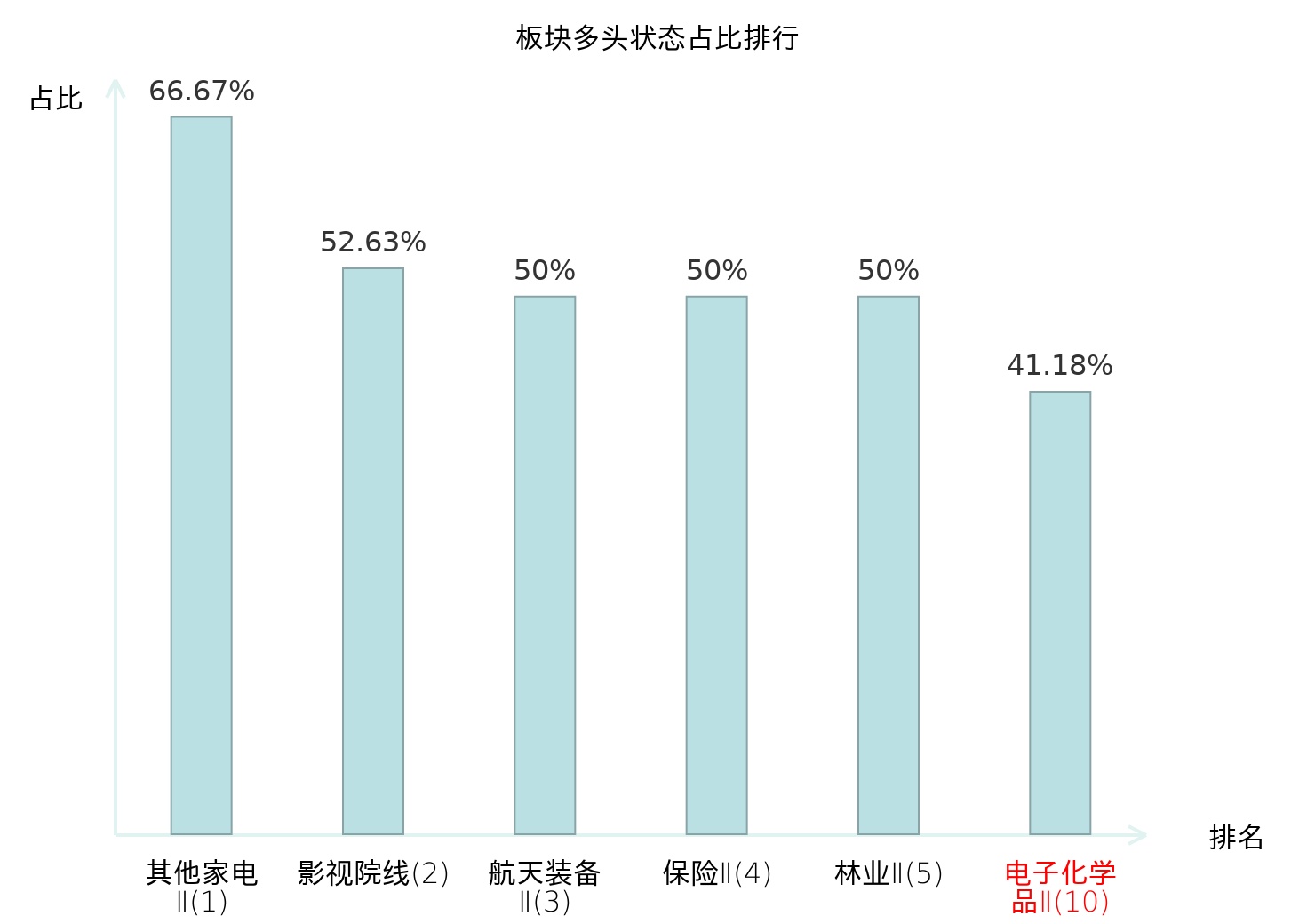 全市场所有行业板块中主力多头状态占比排名中,其他家电Ⅱ板块位居第一。林业Ⅱ板块名次提升最快,较昨日上升76位。