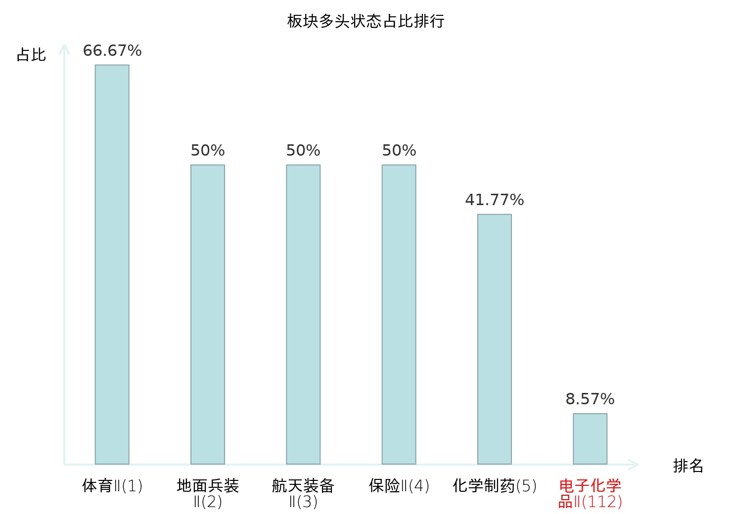 全市场所有行业板块中主力多头状态占比排名中,体育Ⅱ板块位居第一。普钢板块名次提升最快,较昨日上升98位。