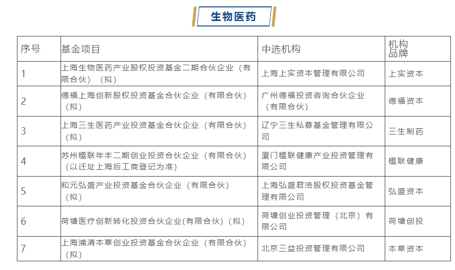 上述7只基金合计提供上海储备投资项目近30项,拟投资金额合计超10亿元。拟投资项目包括基因细胞治疗、核药、脑机接口、合成生物学等赛道,体现上海生物医药先导产业鼓励创新策源、发挥龙头效应的特点。此外,7只基金合计提供上海招引项目十余项,覆盖国内龙头上市公司投资/孵化公司,放大上海生物医药全球化效应。