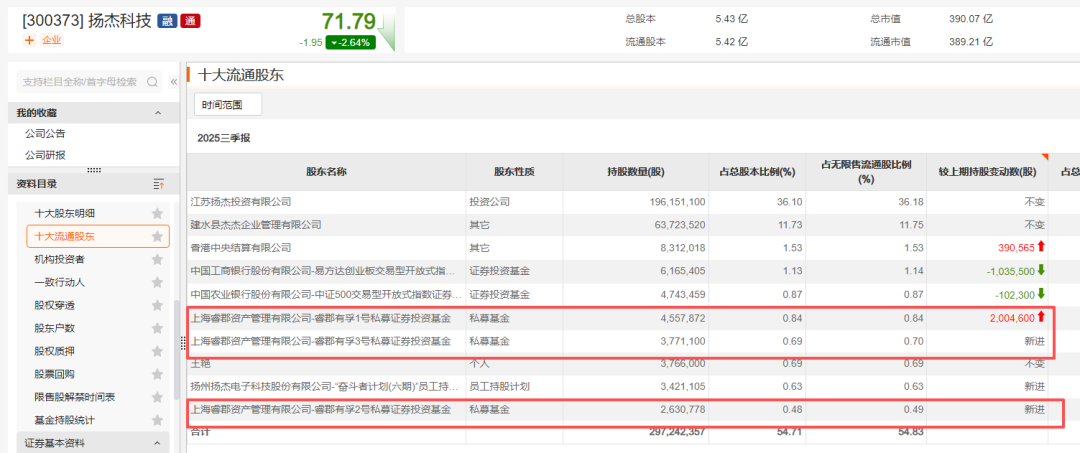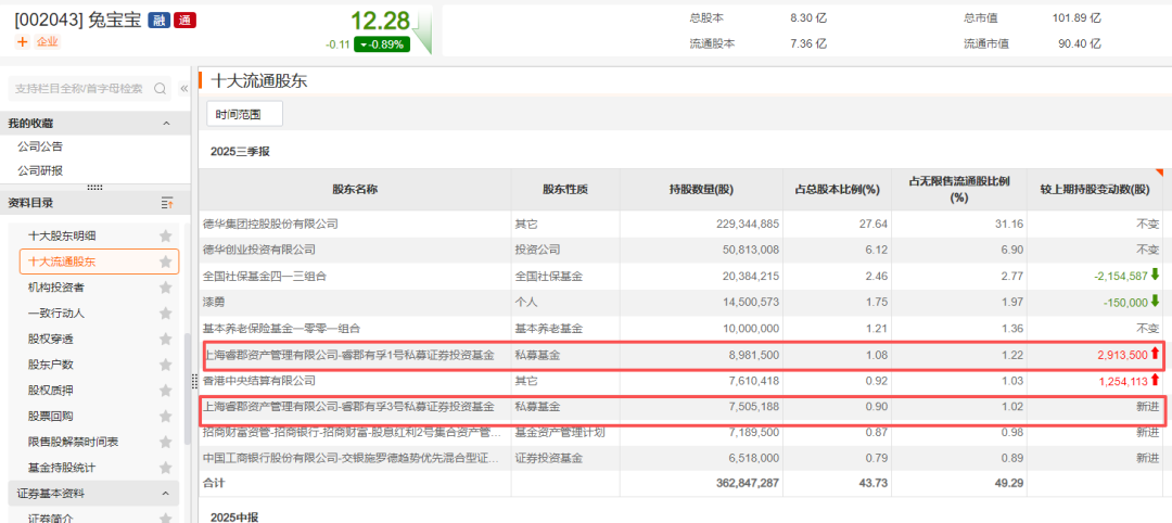 兔宝宝近期发布的三季报显示,截至三季度末,睿郡有孚1号私募证券投资基金持有该公司898万股,相较于二季度末增持291.4万股。同期,睿郡有孚3号私募证券投资基金更是新进该公司前十大流通股股东名单。
