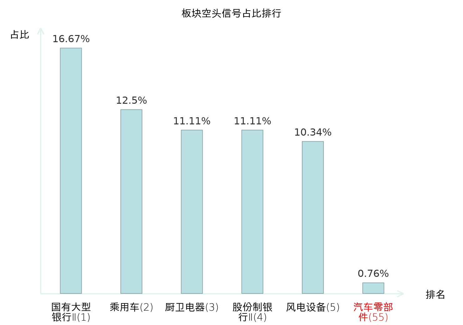 全市场所有行业板块中主力空头信号占比排名中,国有大型银行Ⅱ板块位居第一。包装印刷板块名次提升最快,较昨日上升117位。