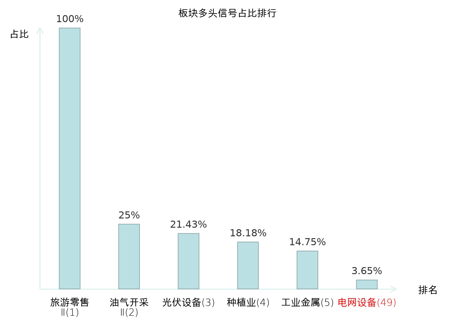 全市场所有行业板块中主力多头信号占比排名中,旅游零售Ⅱ板块位居第一。旅游零售Ⅱ板块名次提升最快,较昨日上升130位。