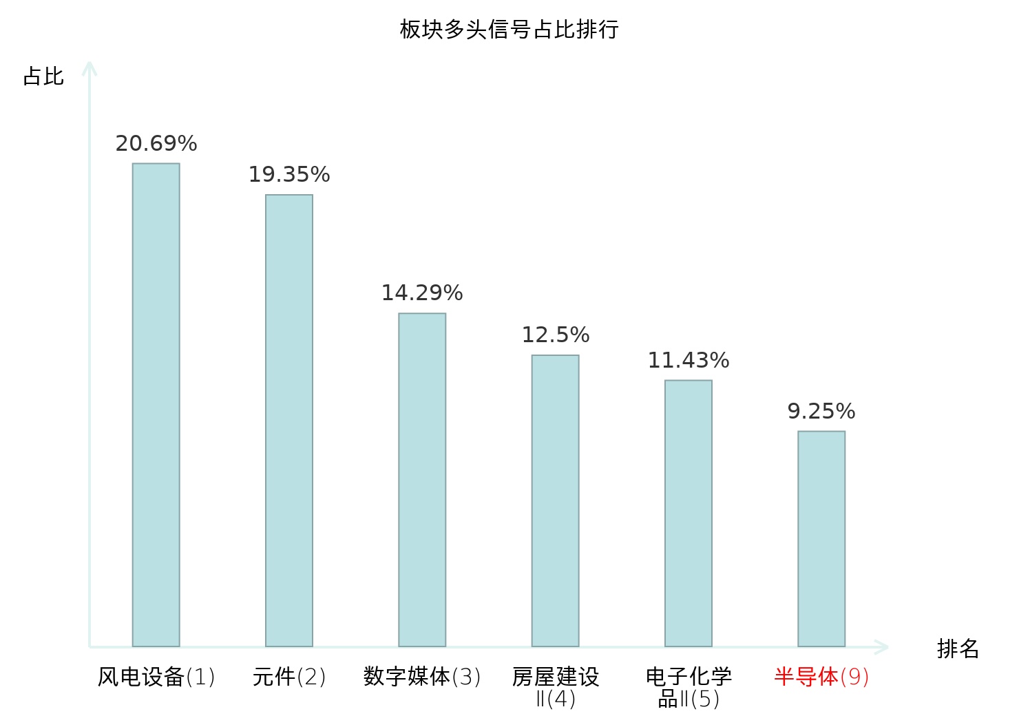全市场所有行业板块中主力多头信号占比排名中,风电设备板块位居第一。房屋建设Ⅱ板块名次提升最快,较昨日上升116位。