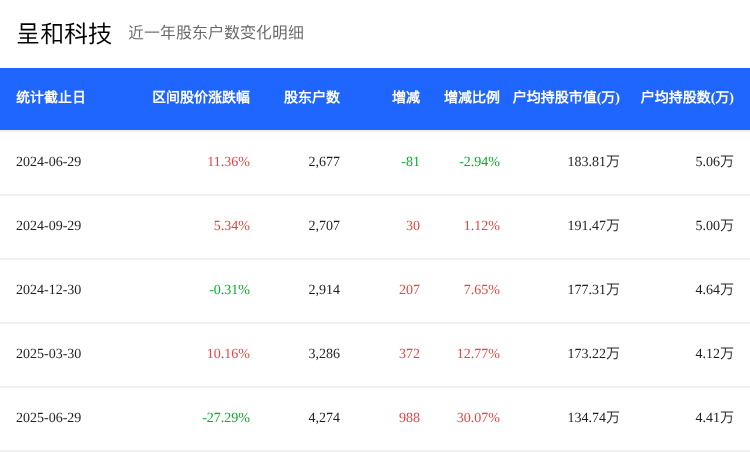 呈和科技(688625)在2025年第二季度股东结构发生了一定变化。截至2025年6月30日,公司股东户数为4274户,较前一季度环比增长30.07%。同时,户均持股数量环比下降6.99%,户均持股市值为134.74万元,环比下降22.21%。