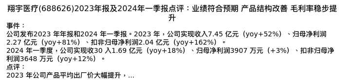 值得注意的是:2024年04月华安证券的分析师,首次发布关于翔宇医疗的研究报告,标题为:翔宇医疗(688626)2023年报及2024年一季报点评:业绩符合预期 产品结构改善 毛利率稳步提升。