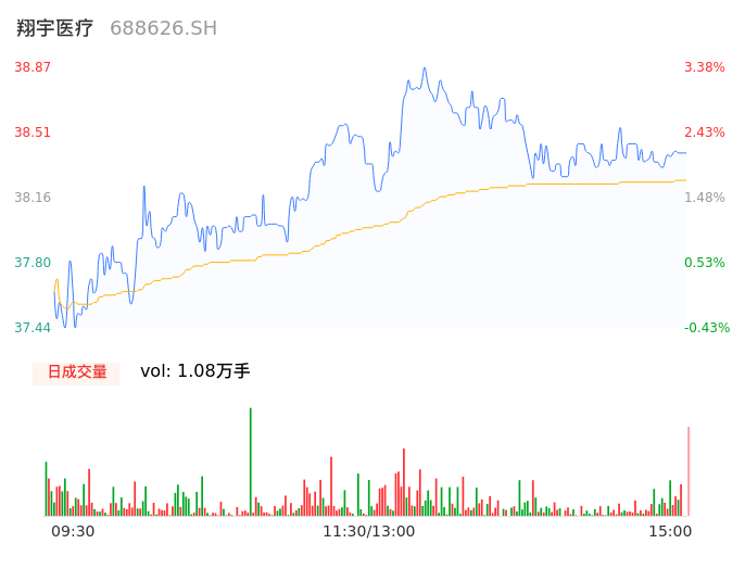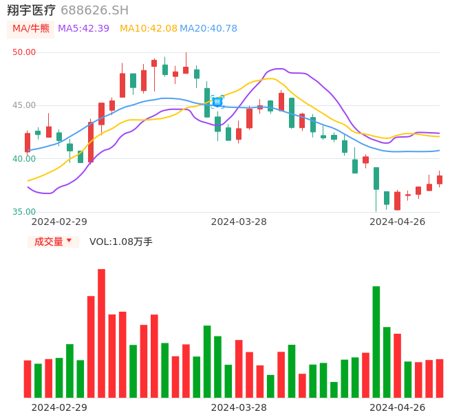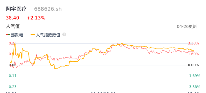 04月26日,翔宇医疗收报38.40,股价涨幅2.13%,成交金额4122.78万元,换手率0.67%。