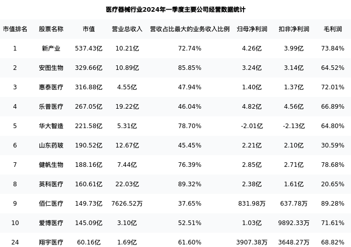翔宇医疗最新报告期数据为一季度,下表汇总了医疗器械行业内市值靠前的公司一季度主要经营数据