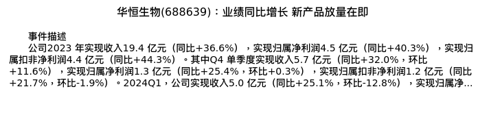 值得注意的是:2024年05月长江证券的马太/魏凯/王岭峰/张韦华分析师,首次发布关于华恒生物的研究报告,标题为:华恒生物(688639):业绩同比增长 新产品放量在即。
