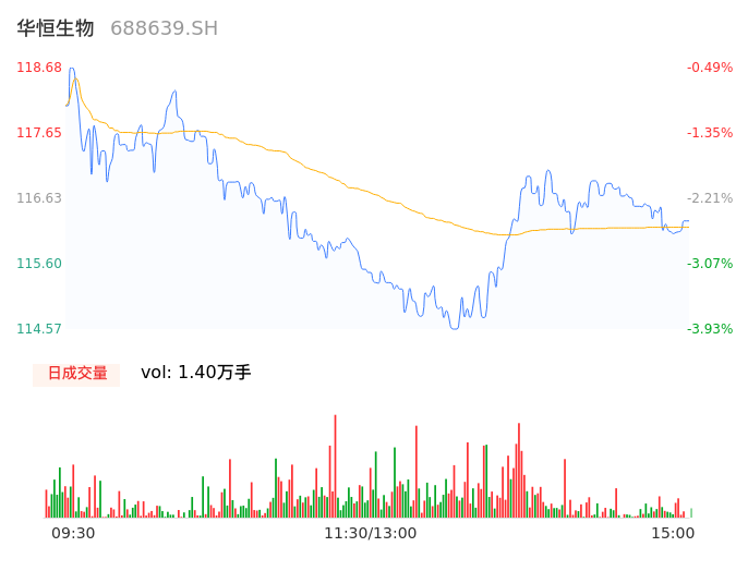 05月15日,华恒生物收报116.12,股价涨幅-2.63%,成交金额1.62亿元,换手率0.89%。
