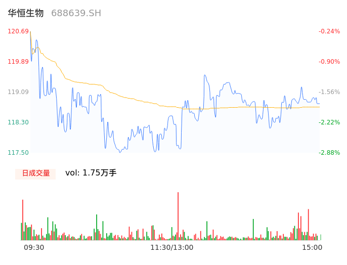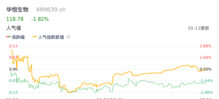 05月13日,华恒生物收报118.78,股价涨幅-1.82%,成交金额2.08亿元,换手率1.11%。