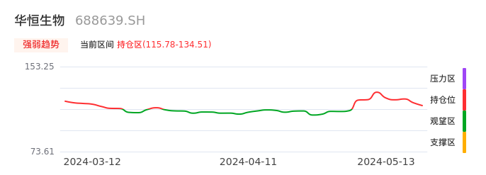 我们来看一下该股的九方特色指标强弱趋势的情况:华恒生物自04月29日从观望区上穿到持仓区。股价近期在多头区域回调整理。后续重点关注多空分界点的争夺:115.78元。如未能有效站稳则可能重新回到空头行情。