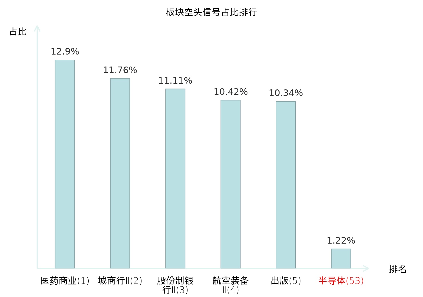 全市场所有行业板块中主力空头信号占比排名中,医药商业板块位居第一。城商行Ⅱ板块名次提升最快,较昨日上升102位。