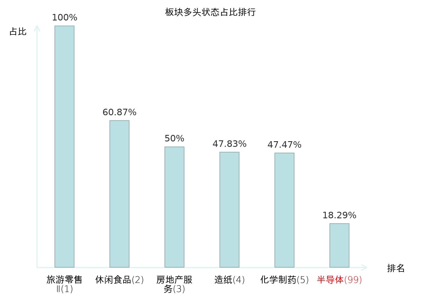 全市场所有行业板块中主力多头状态占比排名中,旅游零售Ⅱ板块位居第一。种植业板块名次提升最快,较昨日上升49位。