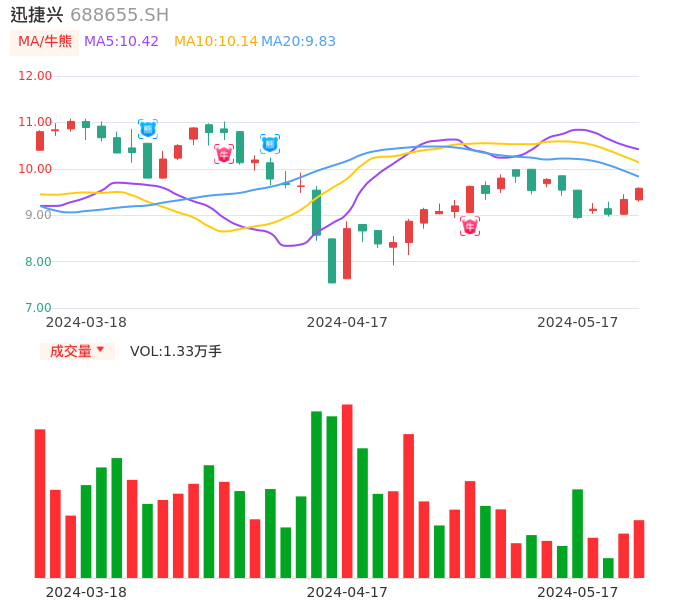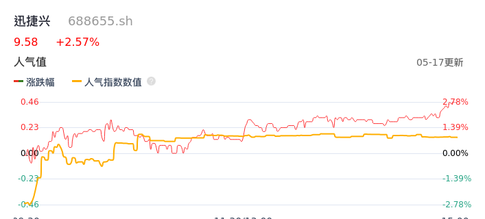 05月17日,迅捷兴收报9.58,股价涨幅2.57%,成交金额1260.60万元,换手率1.00%。