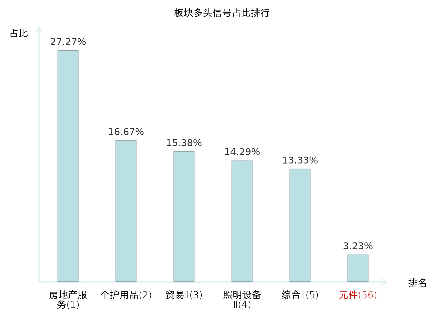 全市场所有行业板块中主力多头信号占比排名中,房地产服务板块位居第一。房地产服务板块名次提升最快,较昨日上升116位。