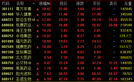 医药板块盘中强势拉升,创新药、疫苗概念表现亮眼。截至收盘,粤万年青华人健康20%涨停,前沿生物悦康药业涨超10%,海王生物福元医药等均涨停。