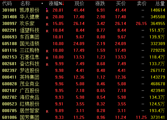 零售股尾盘集体飙升,截至收盘,凯淳股份华人健康20%涨停,欢乐家涨超15%,东百集团国光连锁三江购物等均涨停。