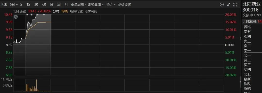 人脑工程概念集体大涨,爱朋医疗开盘20%涨停。医药板块走强,北陆药业直线拉升20%涨停。