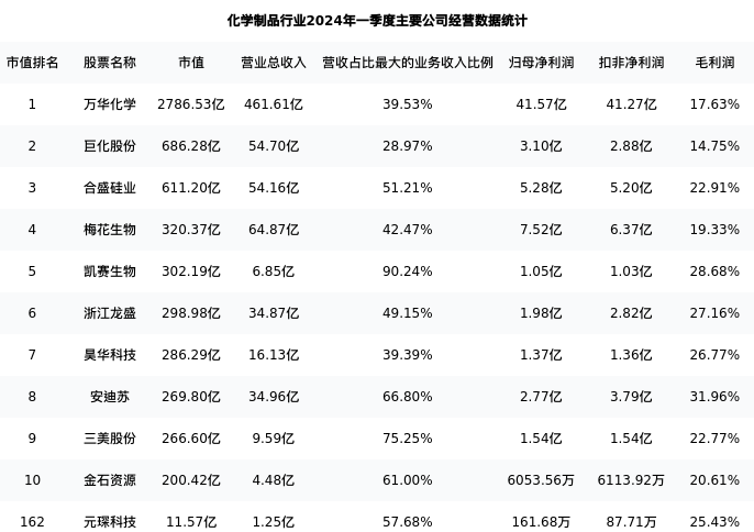 元琛科技最新报告期数据为一季度,下表汇总了化学制品行业内市值靠前的公司一季度主要经营数据