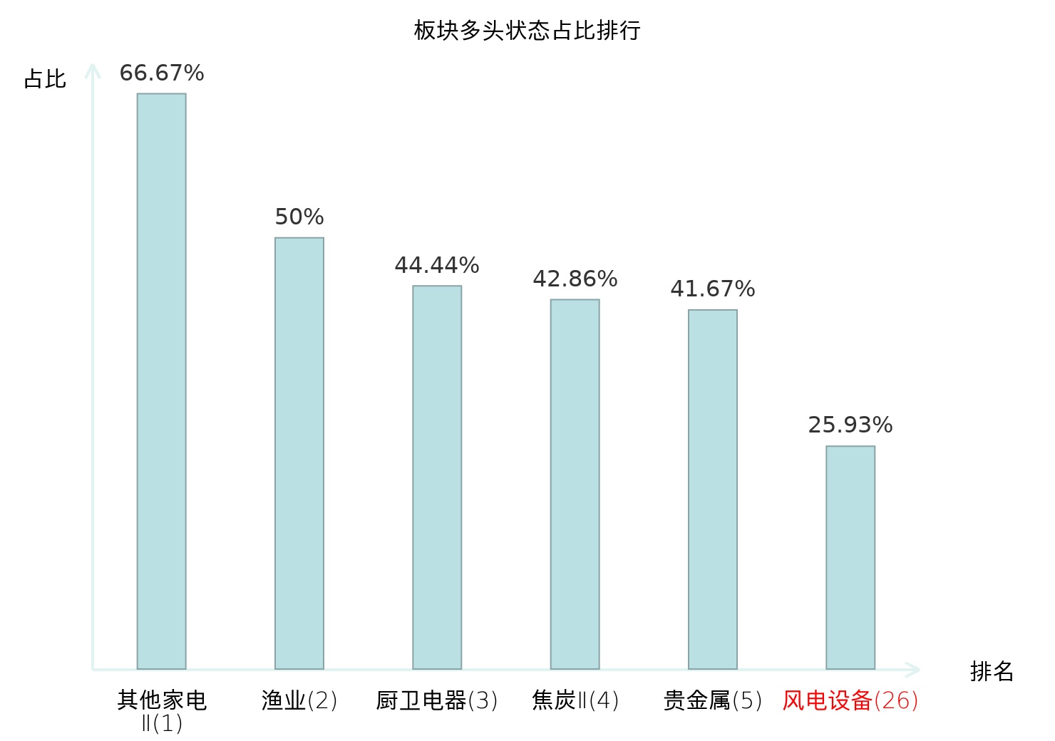 全市场所有行业板块中主力多头状态占比排名中,其他家电Ⅱ板块位居第一。乘用车板块名次提升最快,较昨日上升82位。