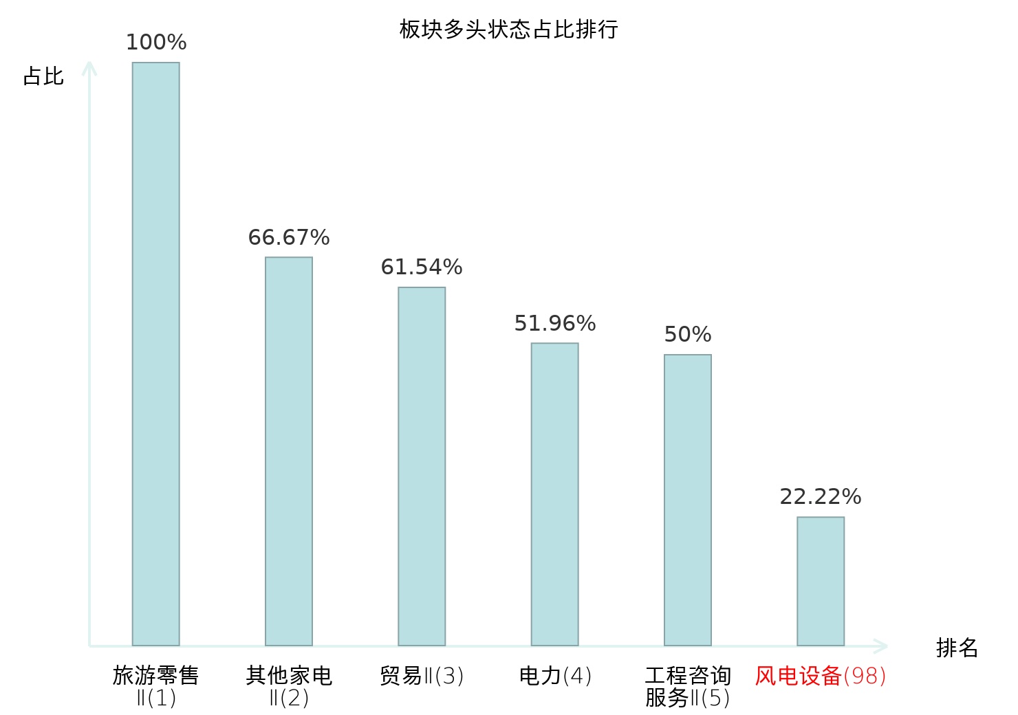 全市场所有行业板块中主力多头状态占比排名中,旅游零售Ⅱ板块位居第一。文娱用品板块名次提升最快,较昨日上升84位。