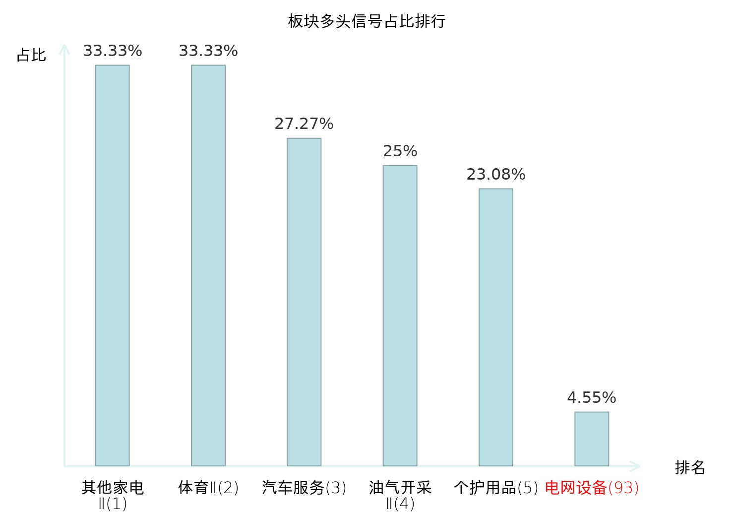 全市场所有行业板块中主力多头信号占比排名中,其他家电Ⅱ板块位居第一。体育Ⅱ板块名次提升最快,较昨日上升128位。