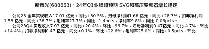 值得注意的是:2024年05月天风证券的孙潇雅/高鑫分析师,首次发布关于新风光的研究报告,标题为:新风光(688663):24年Q1业绩超预期 SVG和高压变频器增长迅速。