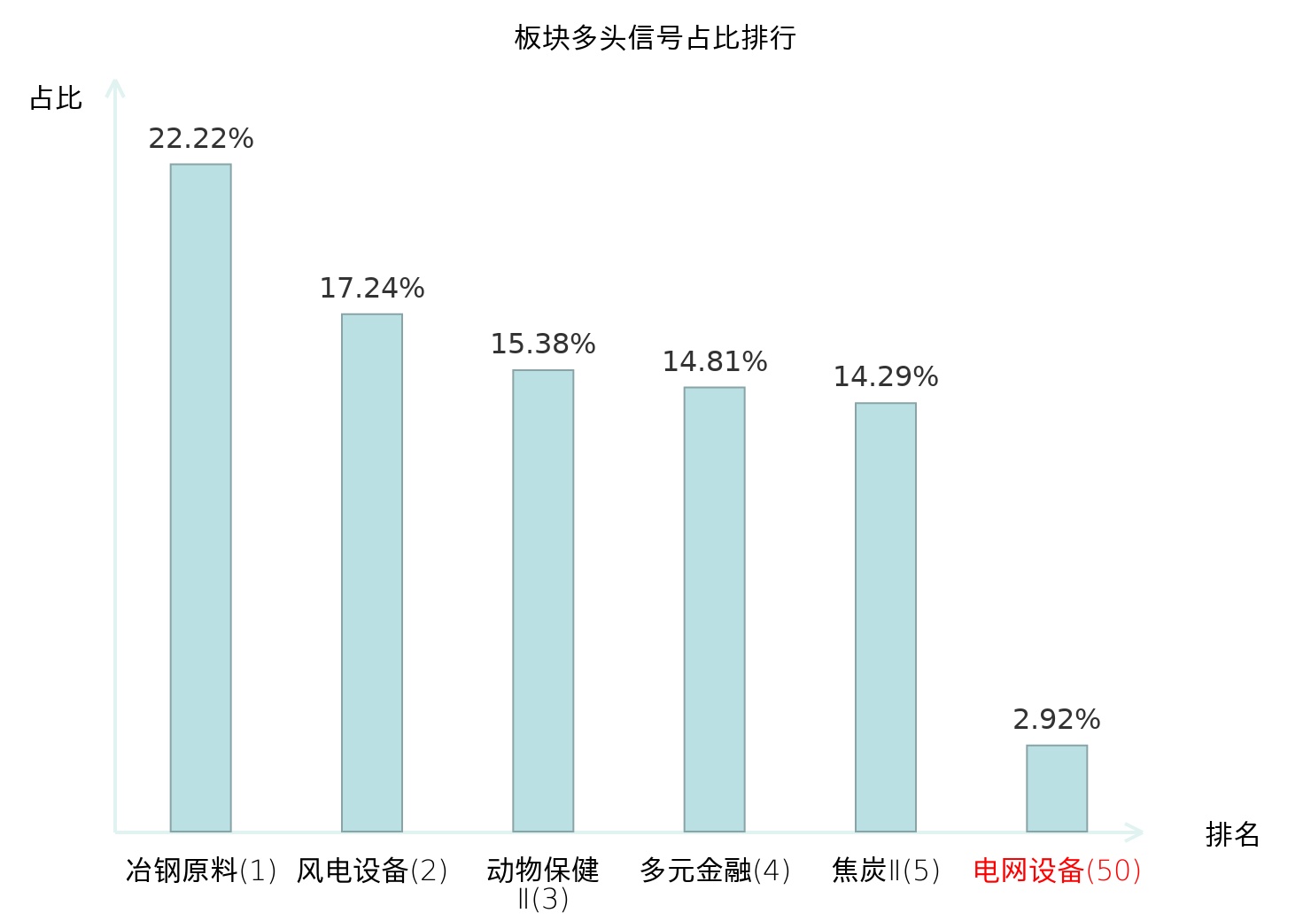 全市场所有行业板块中主力多头信号占比排名中,冶钢原料板块位居第一。冶钢原料板块名次提升最快,较昨日上升118位。