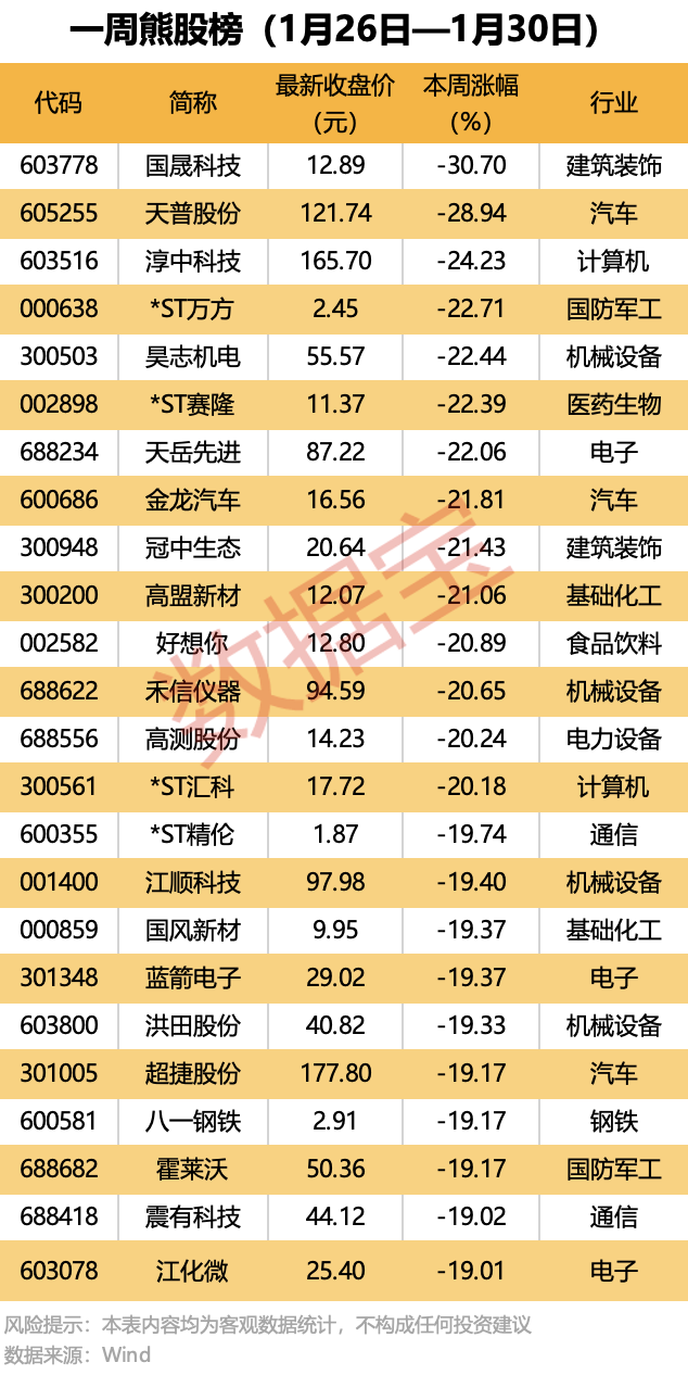 本周累计下跌的个股中,超460股跌幅在10%以上,国晟科技一周累计跌30.7%,居首;天普股份、淳中科技和*ST万方等累计跌幅均超20%。