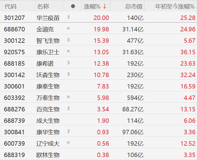 A股市场疫苗股集体走强,其中,华兰疫苗、金迪克20CM涨停,智飞生物涨超15%,康乐卫士涨超13%,康希诺涨超12%,沃森生物涨超10%,康泰生物涨超7%,万泰生物涨近6%。