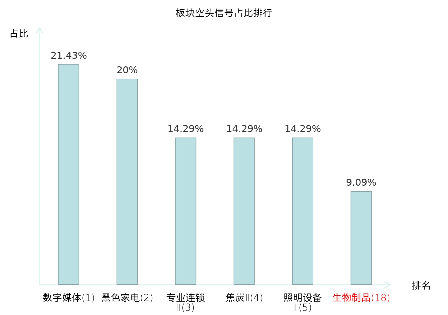 全市场所有行业板块中主力空头信号占比排名中,数字媒体板块位居第一。装修装饰Ⅱ板块名次提升最快,较昨日上升110位。