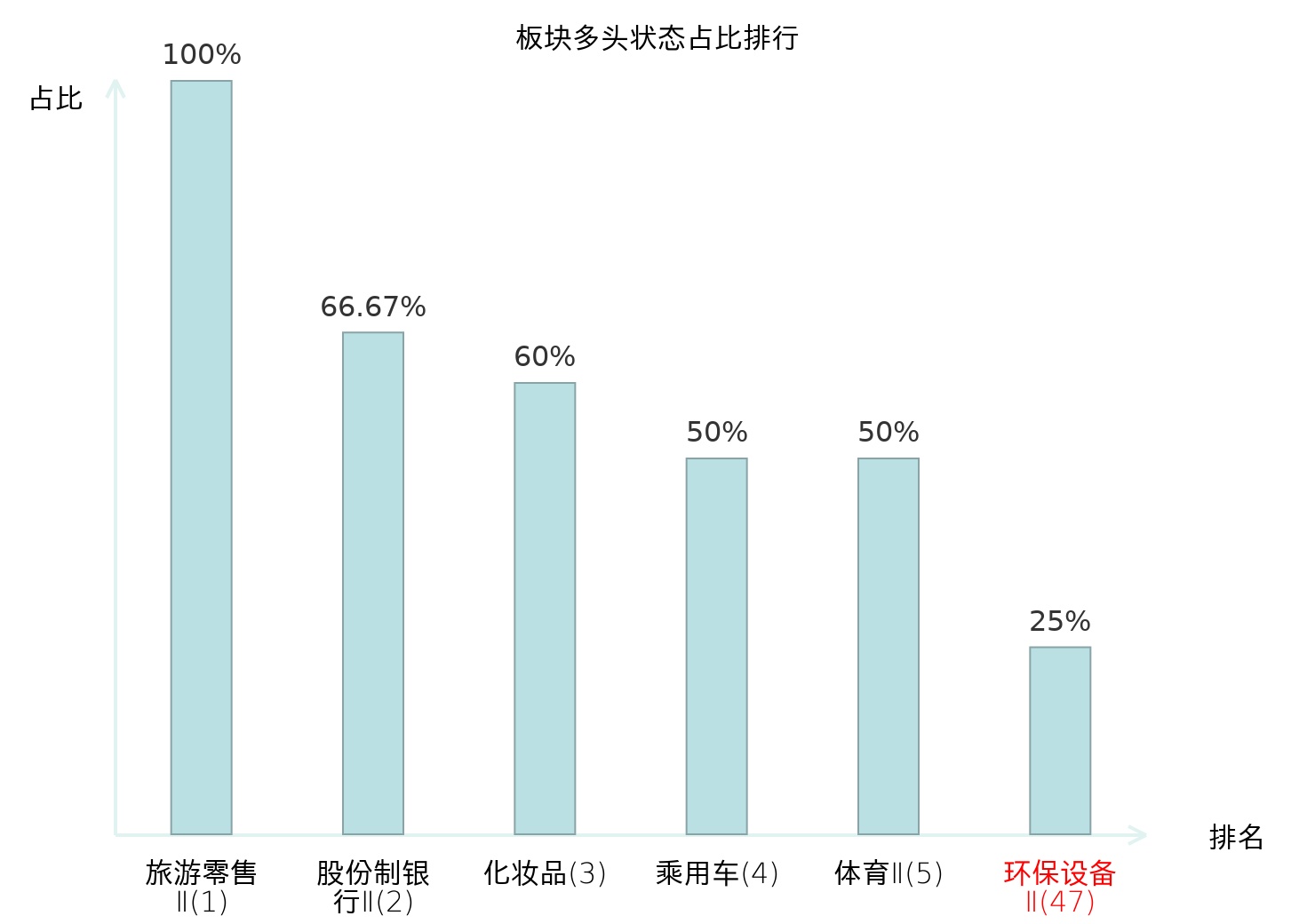 全市场所有行业板块中主力多头状态占比排名中,旅游零售Ⅱ板块位居第一。旅游零售Ⅱ板块名次提升最快,较昨日上升130位。
