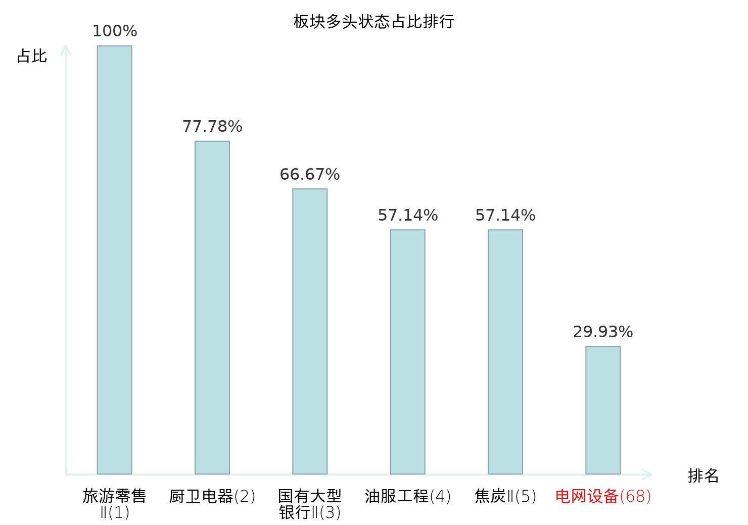 全市场所有行业板块中主力多头状态占比排名中,旅游零售Ⅱ板块位居第一。房地产服务板块名次提升最快,较昨日上升71位。