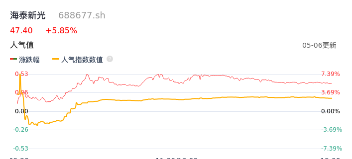 05月06日,海泰新光收报47.40,股价涨幅5.85%,成交金额9784.23万元,换手率1.71%。