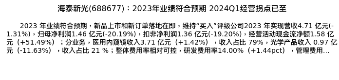 值得注意的是:2024年05月开源证券的余汝意/司乐致分析师,首次发布关于海泰新光的研究报告,标题为:海泰新光(688677):2023年业绩符合预期 2024Q1经营拐点已至。