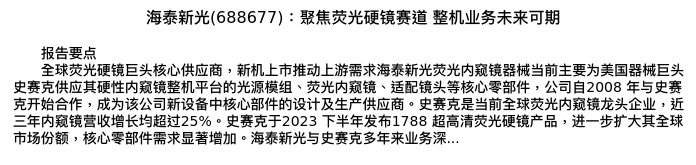 值得注意的是:2024年05月国元证券的马云涛分析师,首次发布关于海泰新光的研究报告,标题为:海泰新光(688677):聚焦荧光硬镜赛道 整机业务未来可期。