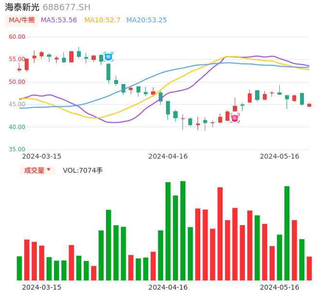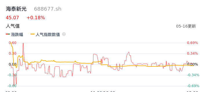 05月16日,海泰新光收报45.07,股价涨幅0.18%,成交金额3179.52万元,换手率0.58%。
