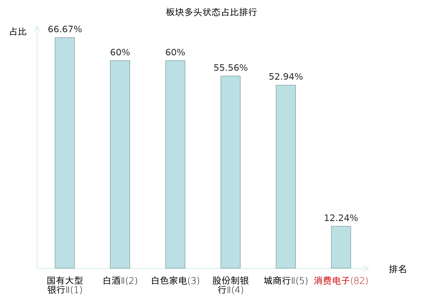 全市场所有行业板块中主力多头状态占比排名中,国有大型银行Ⅱ板块位居第一。医疗美容板块名次提升最快,较昨日上升110位。