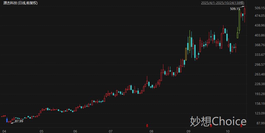 10G激光器芯片市场份额全球第一的源杰科技周五盘中一度涨超7%,最高触及509.15元/股,刷新历史新高,最新总市值超429亿元。拉长时间来看,源杰科技股价自4月低点迄今累计最大涨幅479%。太平洋证券分析师张世杰等人10月14日研报认为,源杰科技深耕光芯片领域,是国内领先的光芯片IDM厂商,下游实现对国际前十大及国内主流光模块厂商如A1、海信宽带、中际旭创、长芯博创等批量供货。公司成功量产CW70mW激光器芯片并实现大批量交付,CW100mW激光器产品也已经通过客户验证,构筑公司新一增长极。