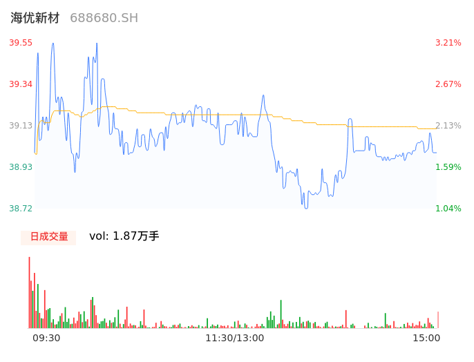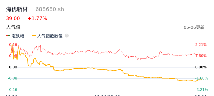 05月06日,海优新材收报39.00,股价涨幅1.77%,成交金额7308.90万元,换手率2.22%。