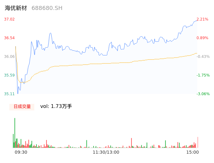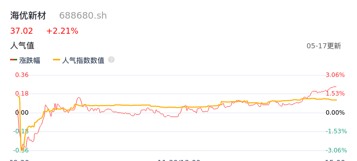 05月17日,海优新材收报37.02,股价涨幅2.21%,成交金额6243.53万元,换手率2.05%。