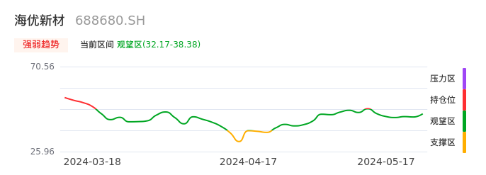 我们来看一下该股的九方特色指标强弱趋势的情况:海优新材自05月10日从持仓区下穿到观望区。股价近期持续下跌后,短期出现止跌迹象。后续重点关注能否再次站上多空分界点:38.38元。如未能有效突破则可能进入新一轮空头行情。