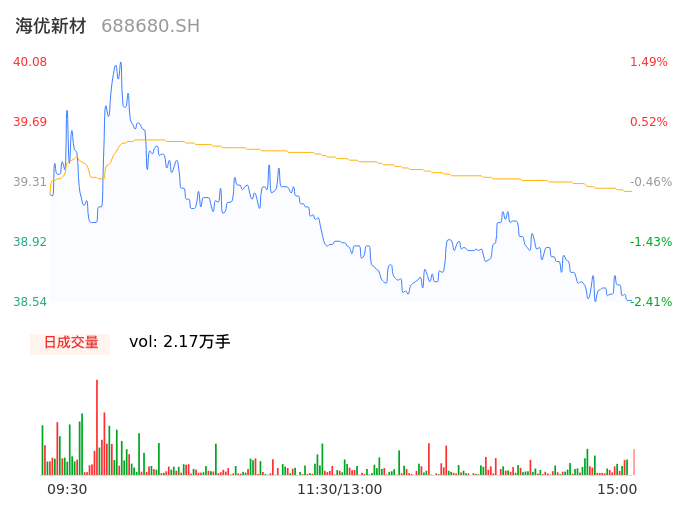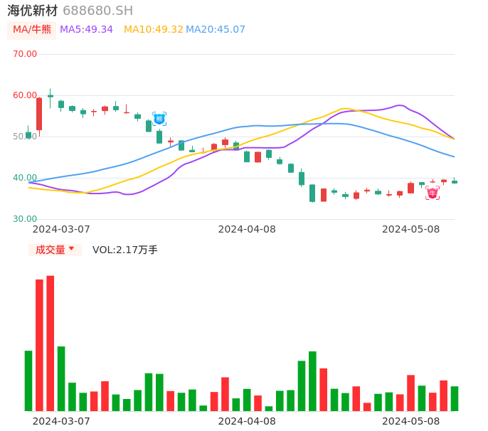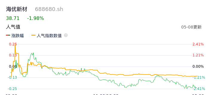 05月08日,海优新材收报38.71,股价涨幅-1.98%,成交金额8516.97万元,换手率2.58%。