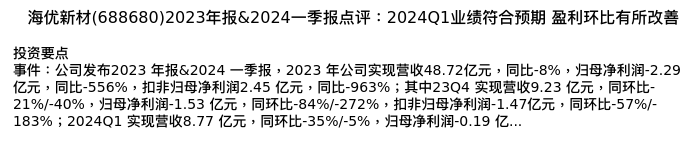 值得注意的是:2024年05月东吴证券的曾朵红/郭亚男/余慧勇分析师,首次发布关于海优新材的研究报告,标题为:海优新材(688680)2023年报&2024一季报点评:2024Q1业绩符合预期 盈利环比有所改善。