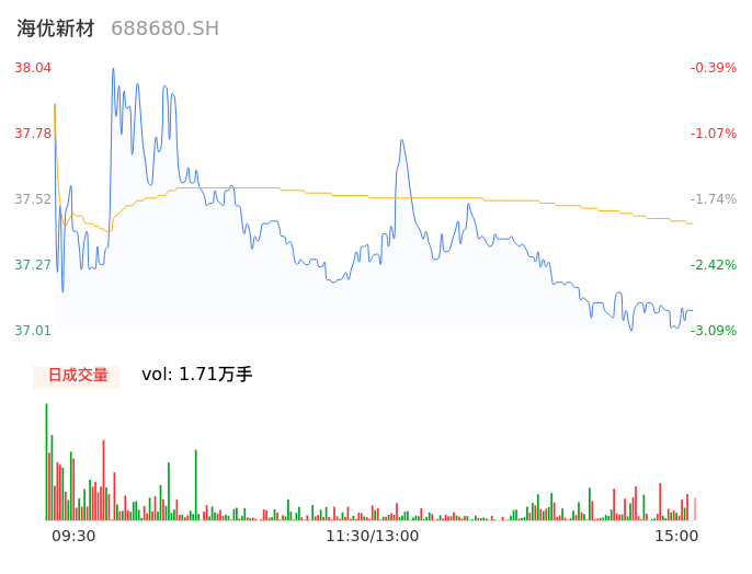 05月13日,海优新材收报37.09,股价涨幅-2.88%,成交金额6414.99万元,换手率2.04%。