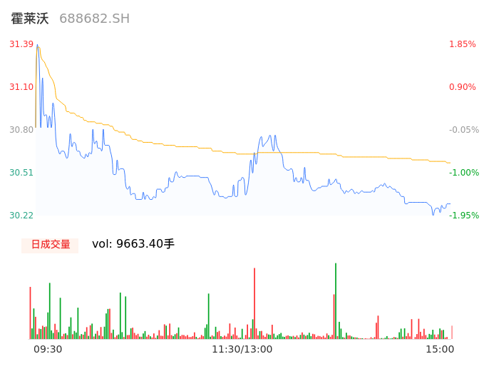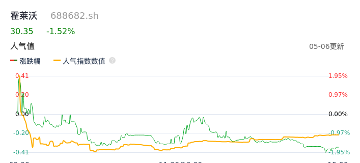 05月06日,霍莱沃收报30.35,股价涨幅-1.52%,成交金额2955.33万元,换手率1.33%。